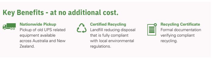 - Collect: Old UPS units are collected anywhere across Australia and New Zealand at no cost, with an efficient delivery and collection process, and safely recycled in line with strict environmental standards
